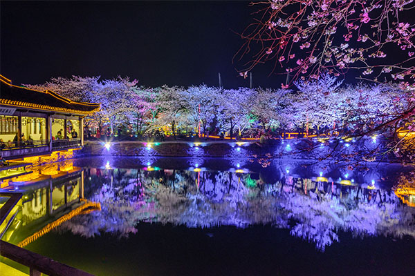 泛光照明设计应以园林中的修建色彩、景观设计、植物群落、文化艺术和娱乐项目为照明元素,突出景观设计和修建特色,营造富有体现力、角度鲜明的山水都会夜景情形气氛。
